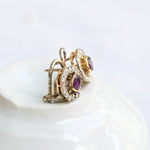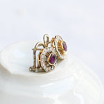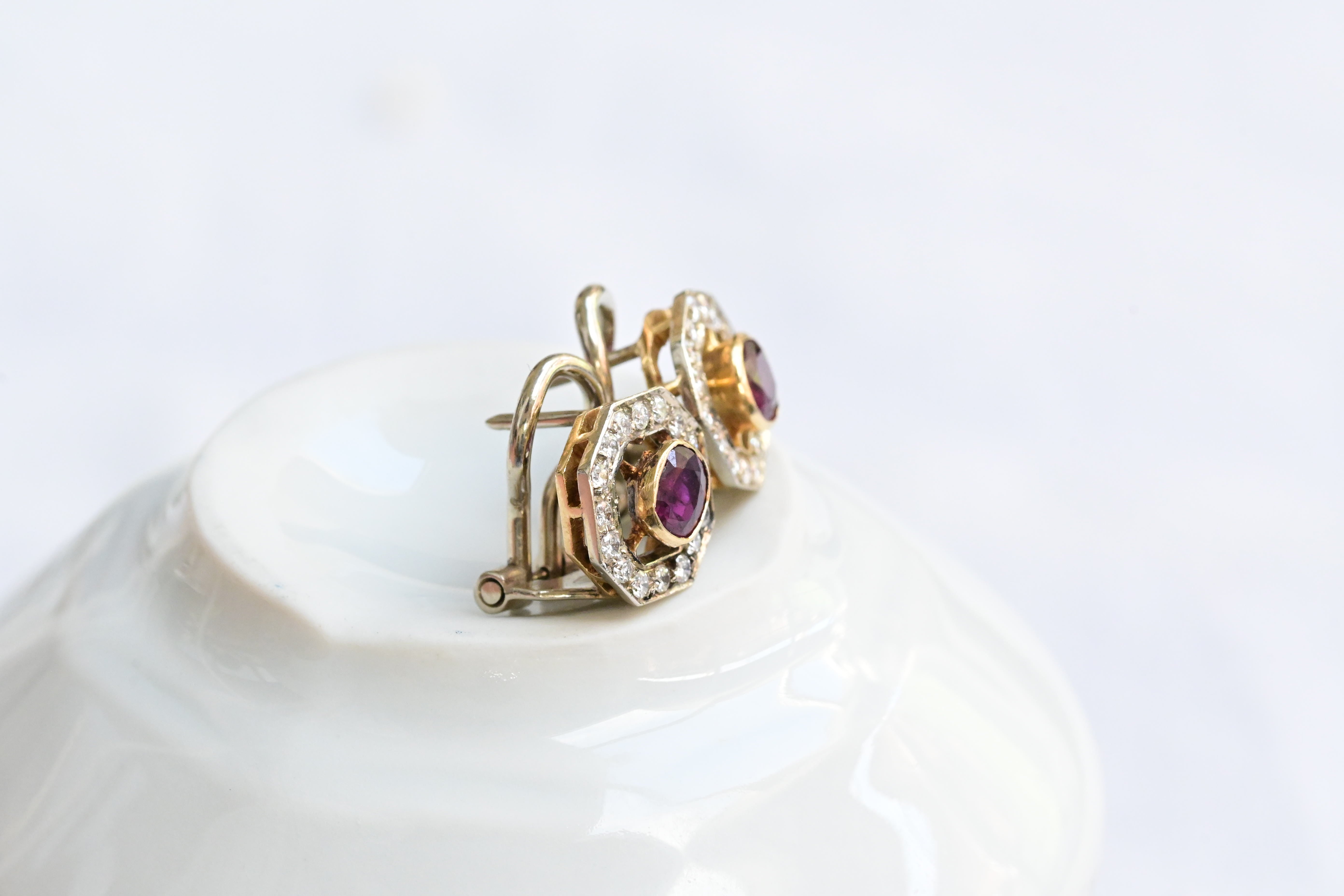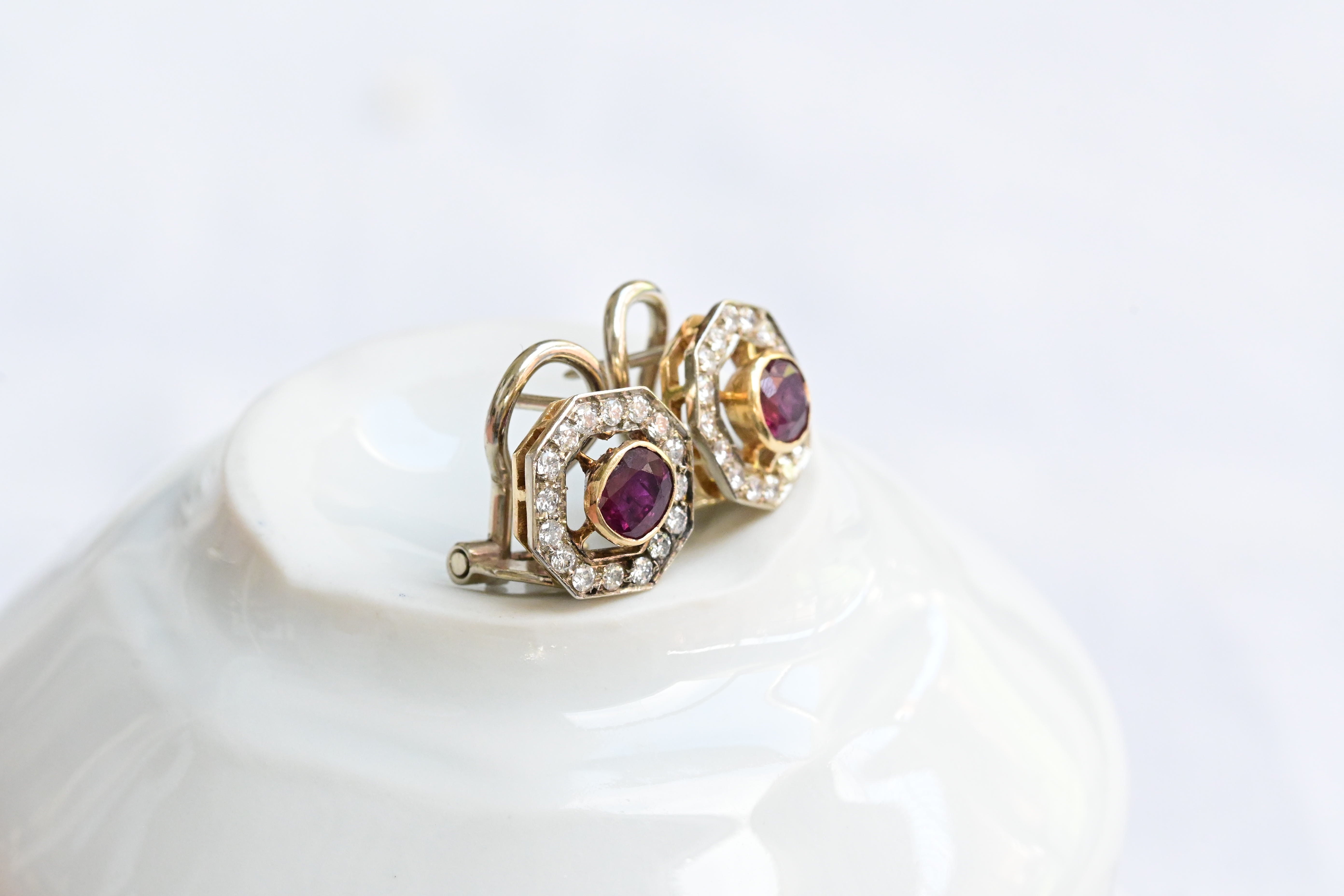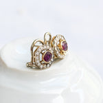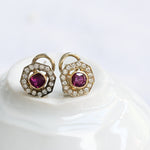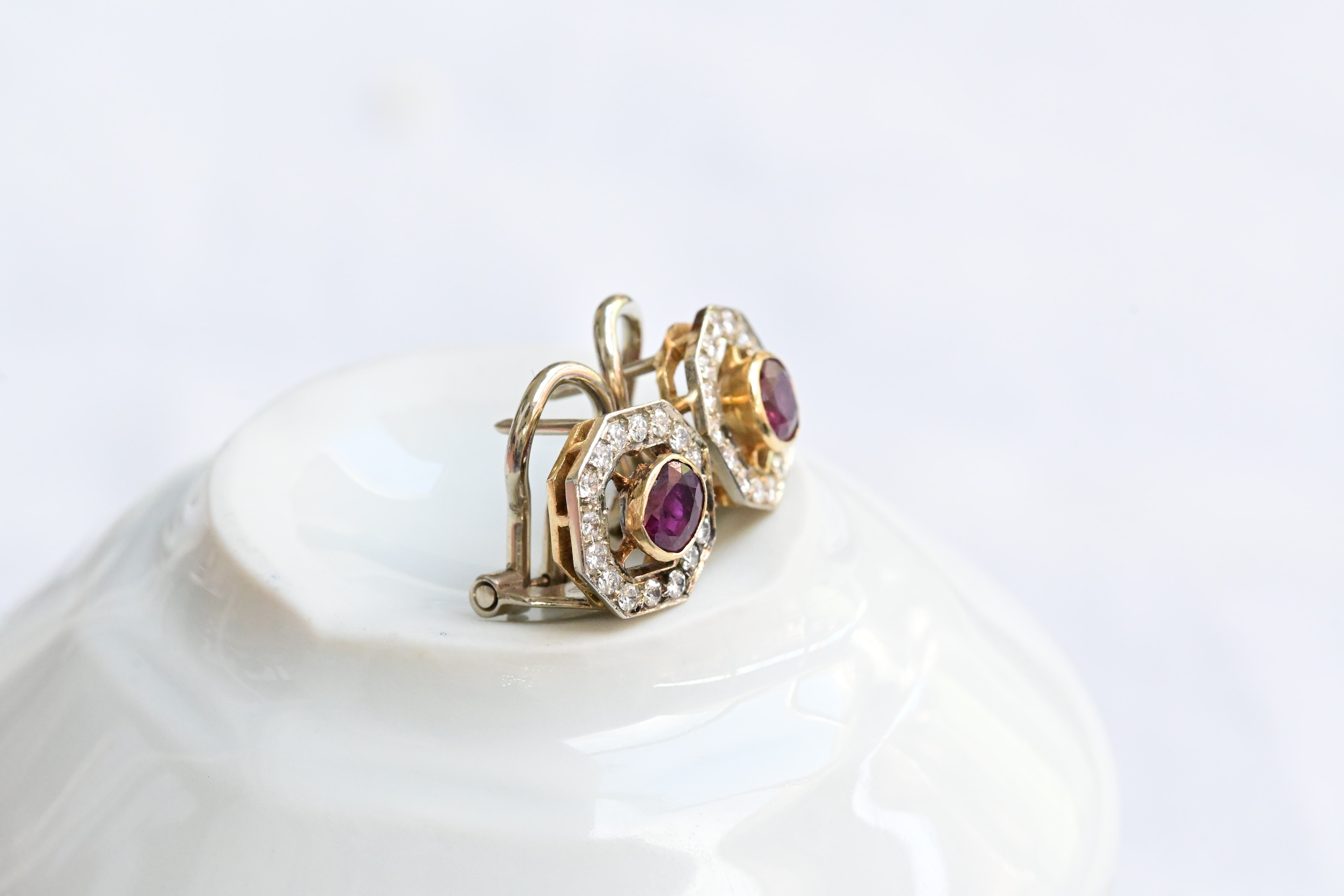 Vintage earrings, from the 1940s decade crafted in 18 K yellow gold featuring a central oval cut ruby and surrounded by sixteen round brilliant cut diamonds