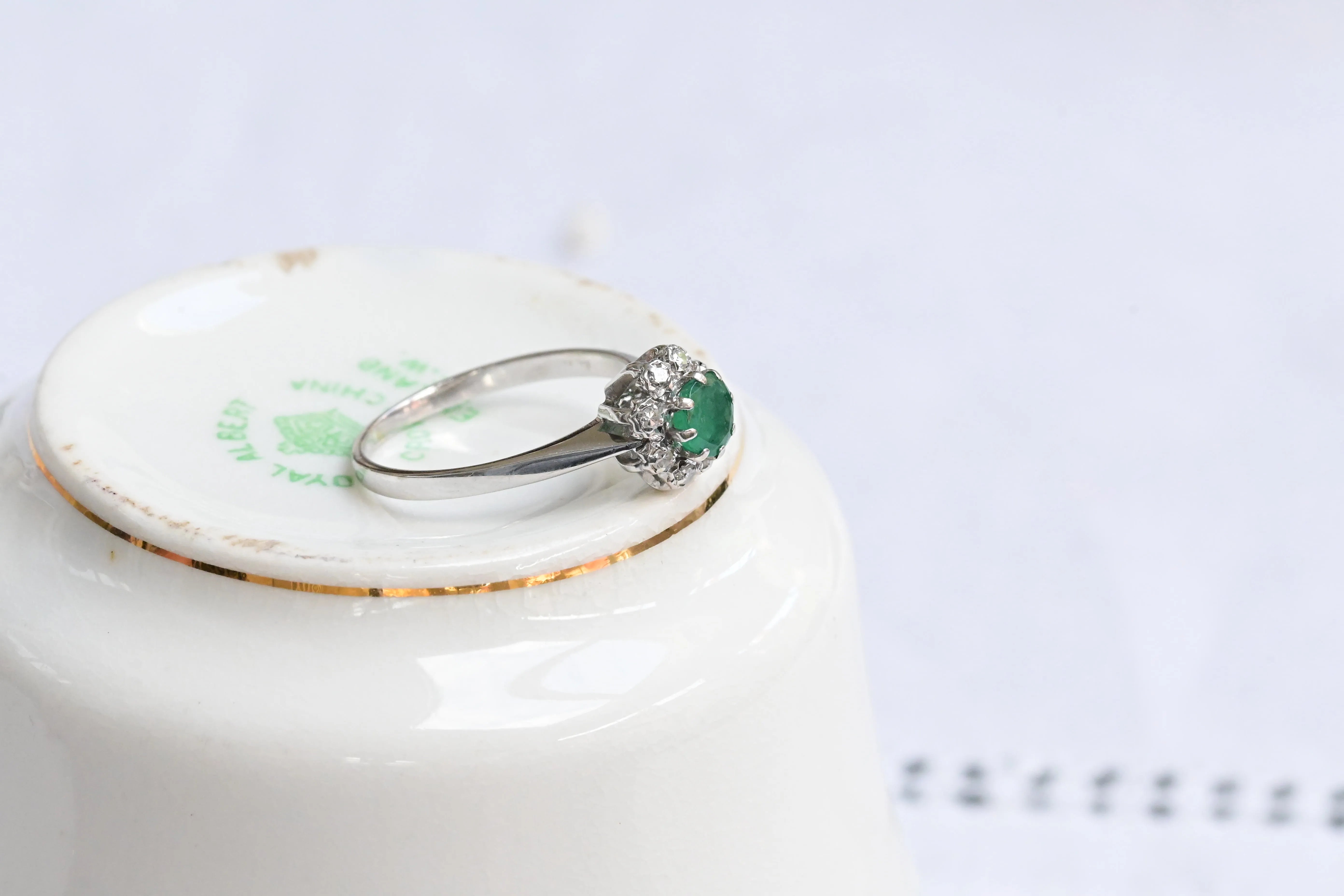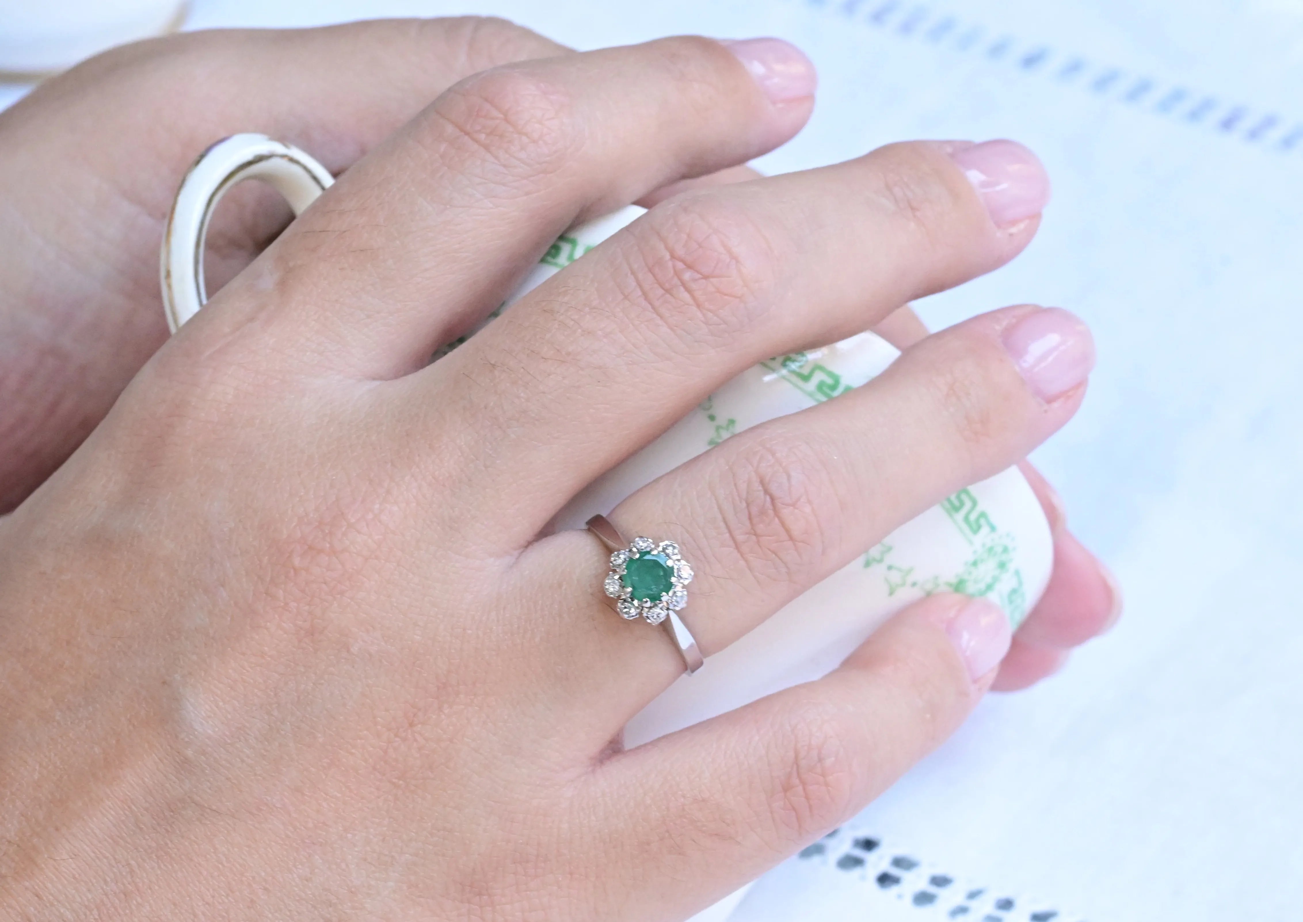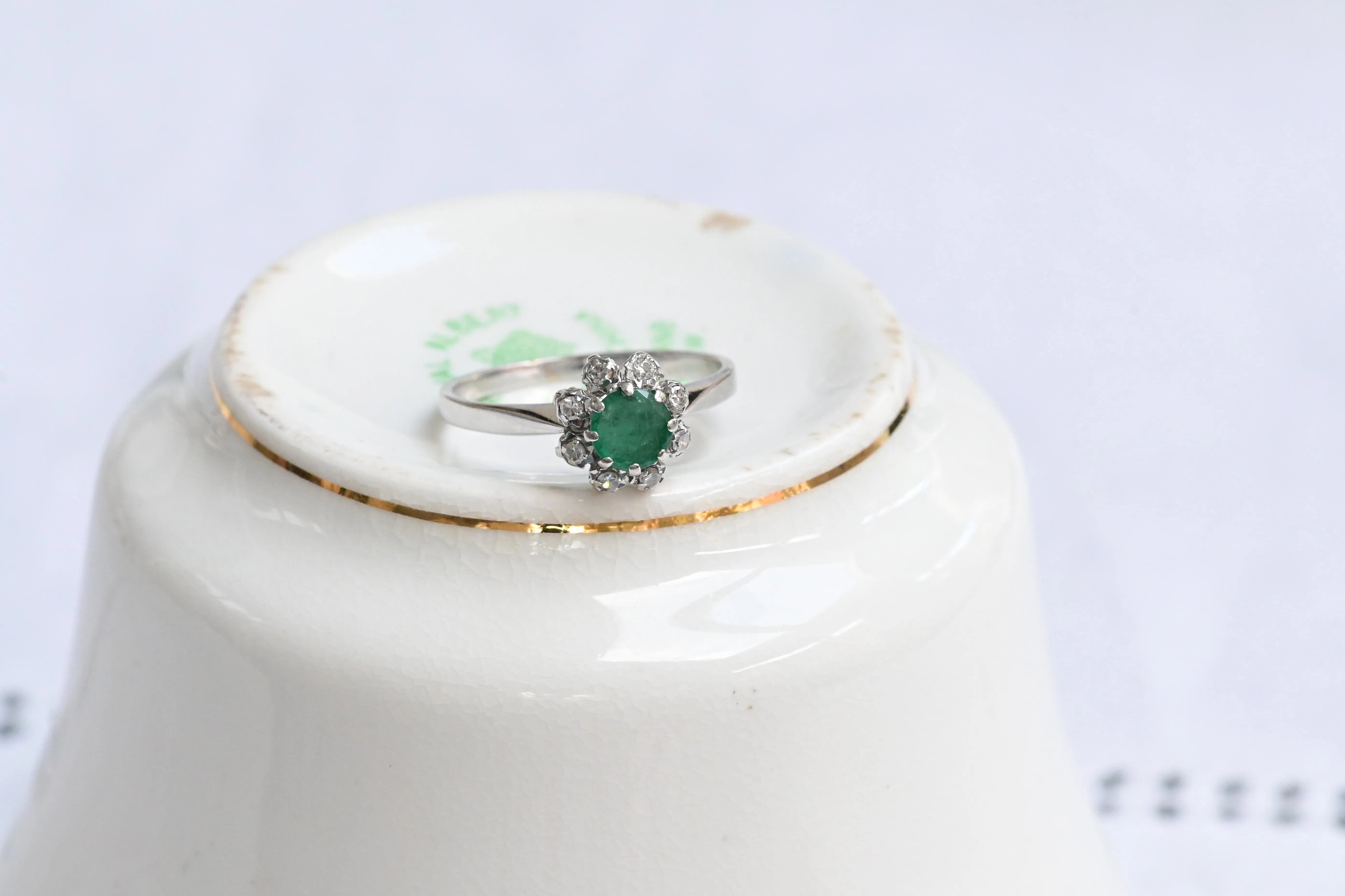 Vintage prstan, izdelan iz 18-karatnega belega zlata, z osrednjim smaragdom okroglega reza, obdanim z osmimi diamanti okroglega briljantnega reza, ki tvorijo cvet.
