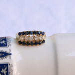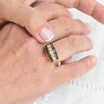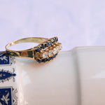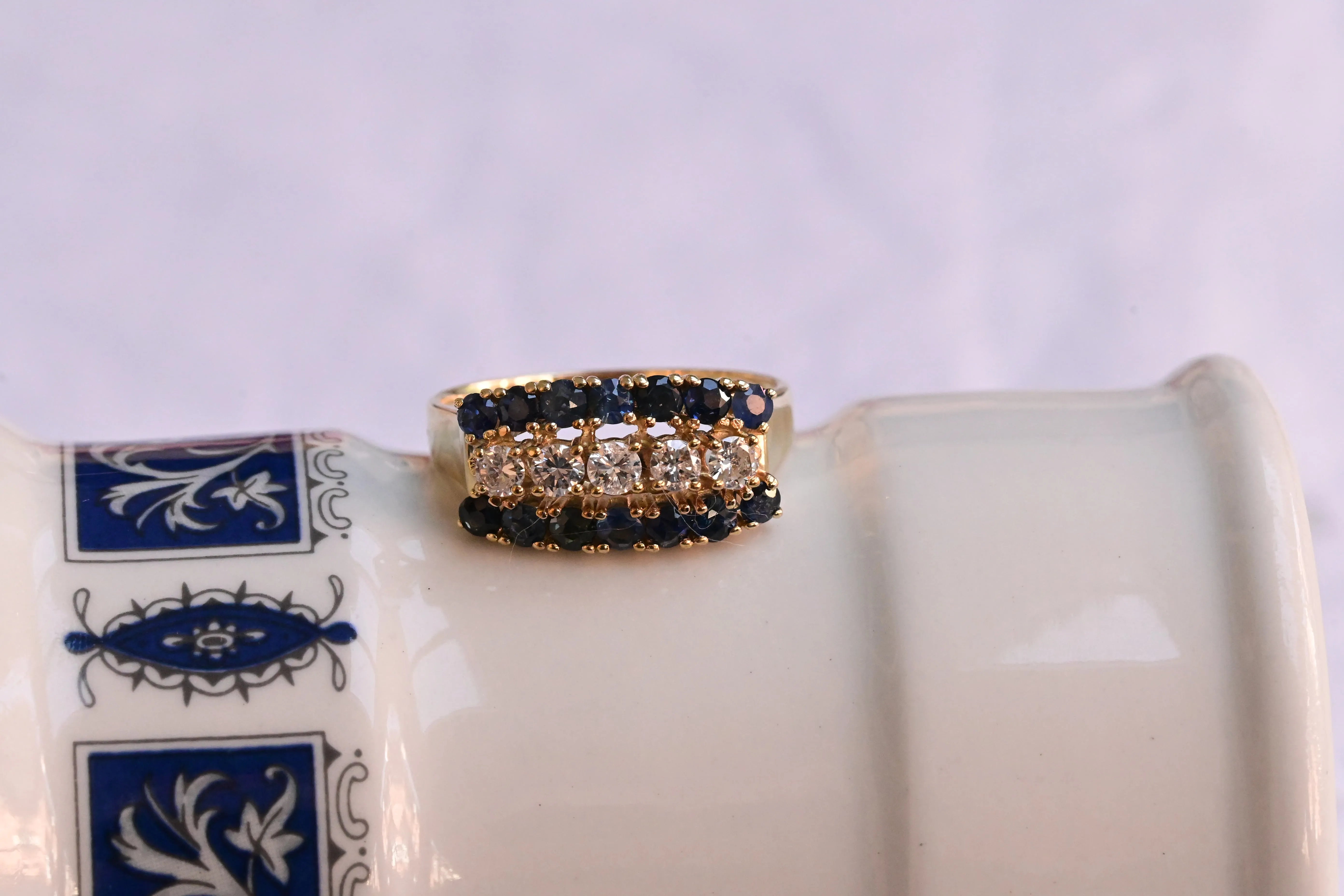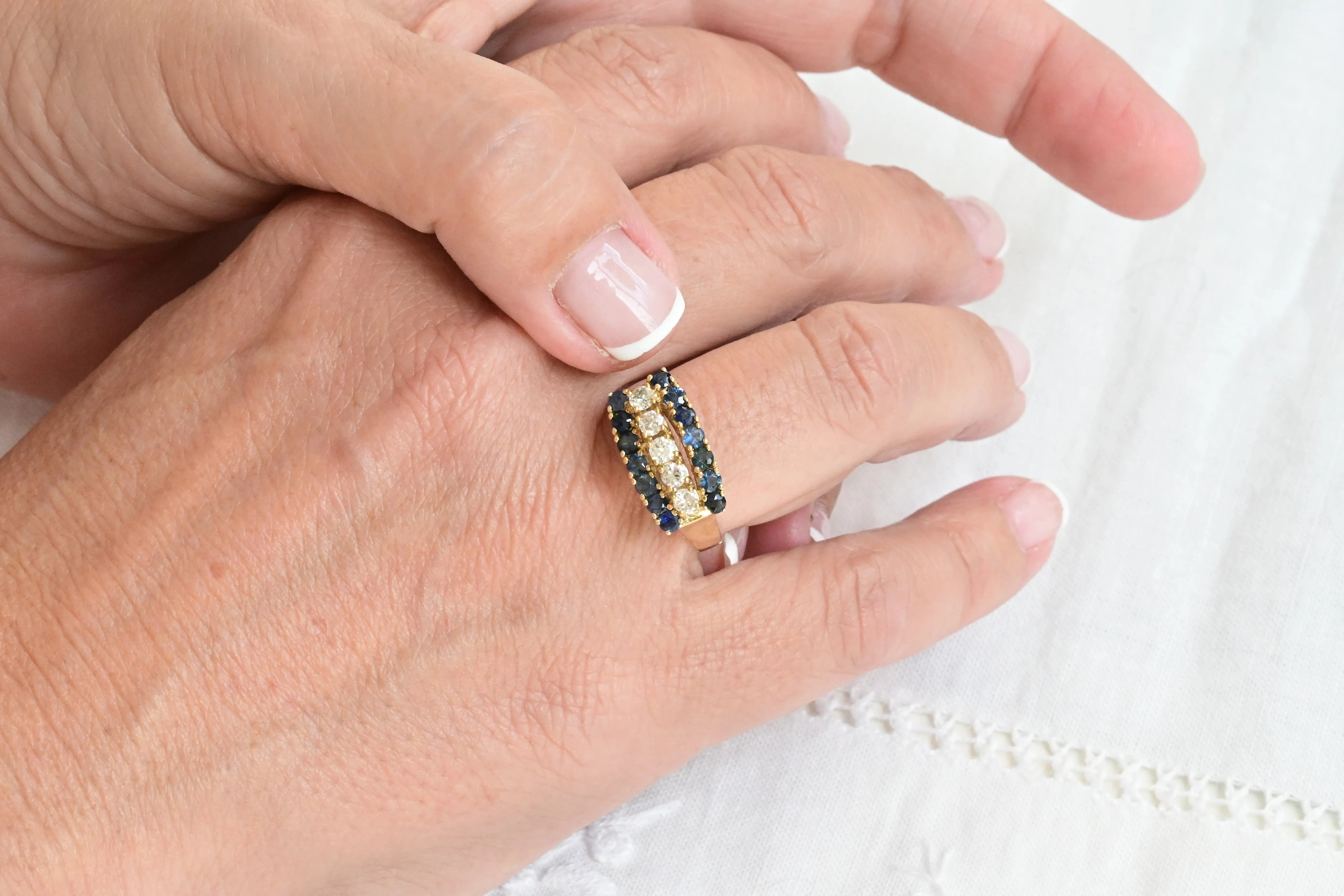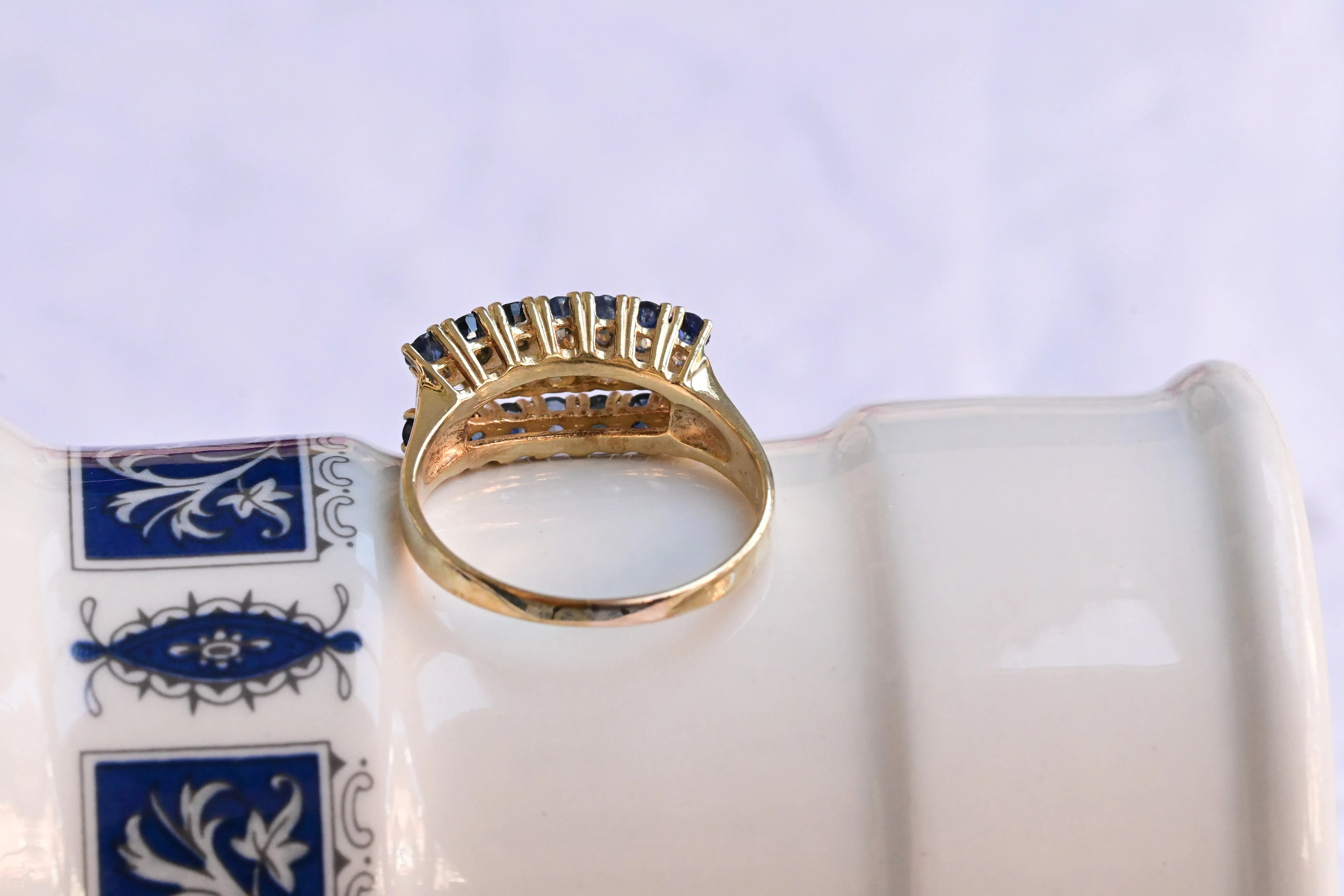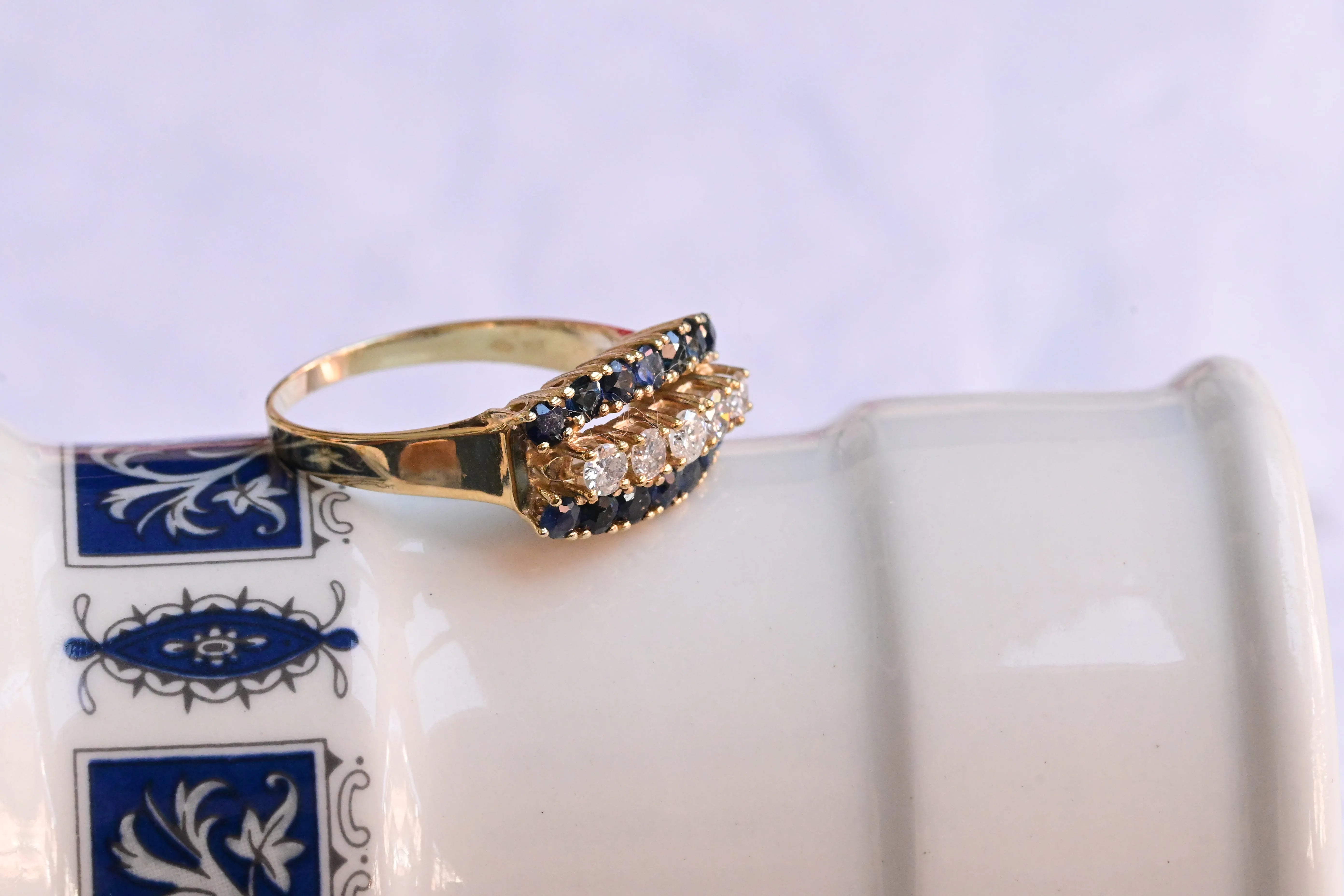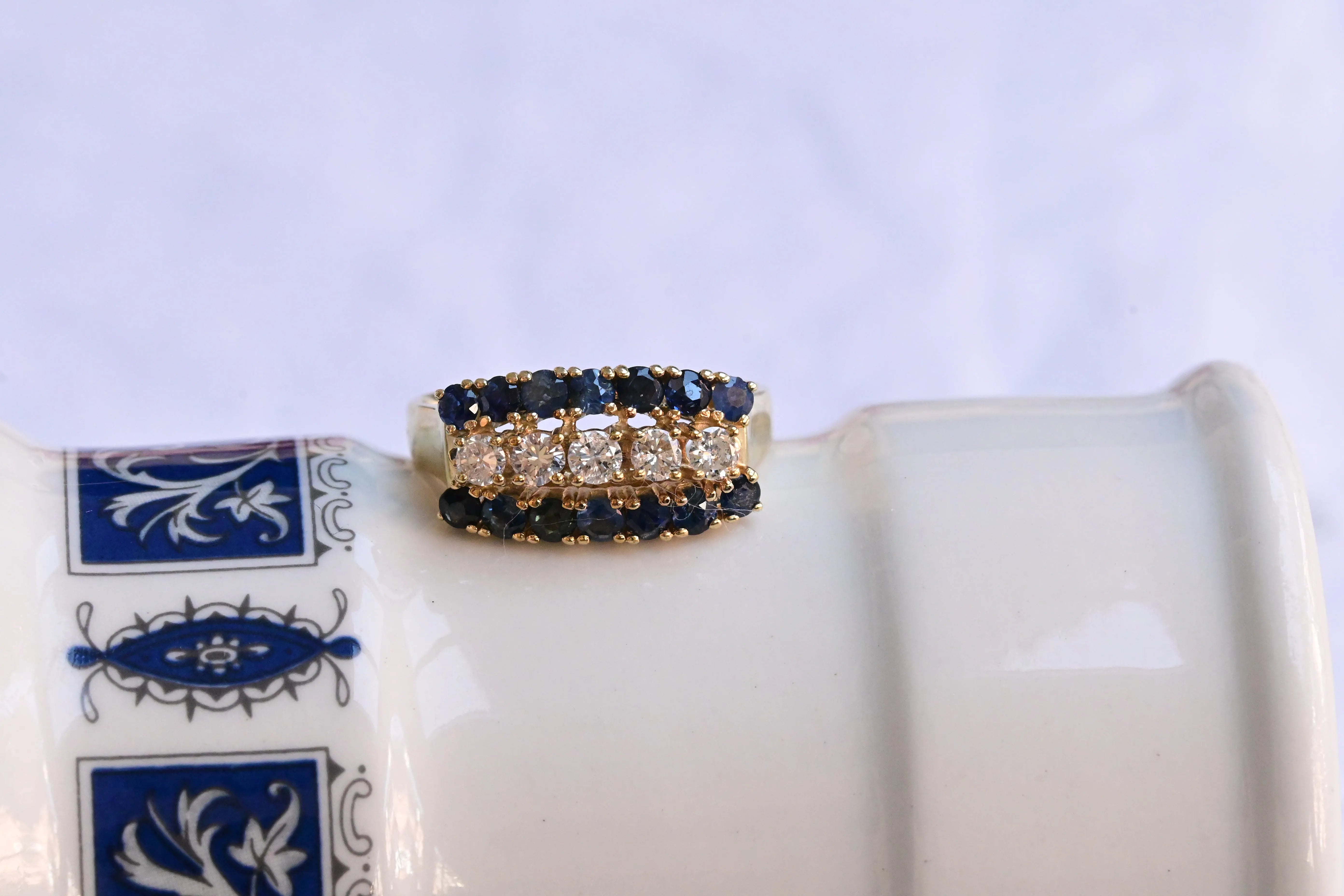 Vintage ring crafted in 14 K yellow gold set with five round brilliant cut diamonds and two rows with a total of 14 round brilliant cut diamonds.